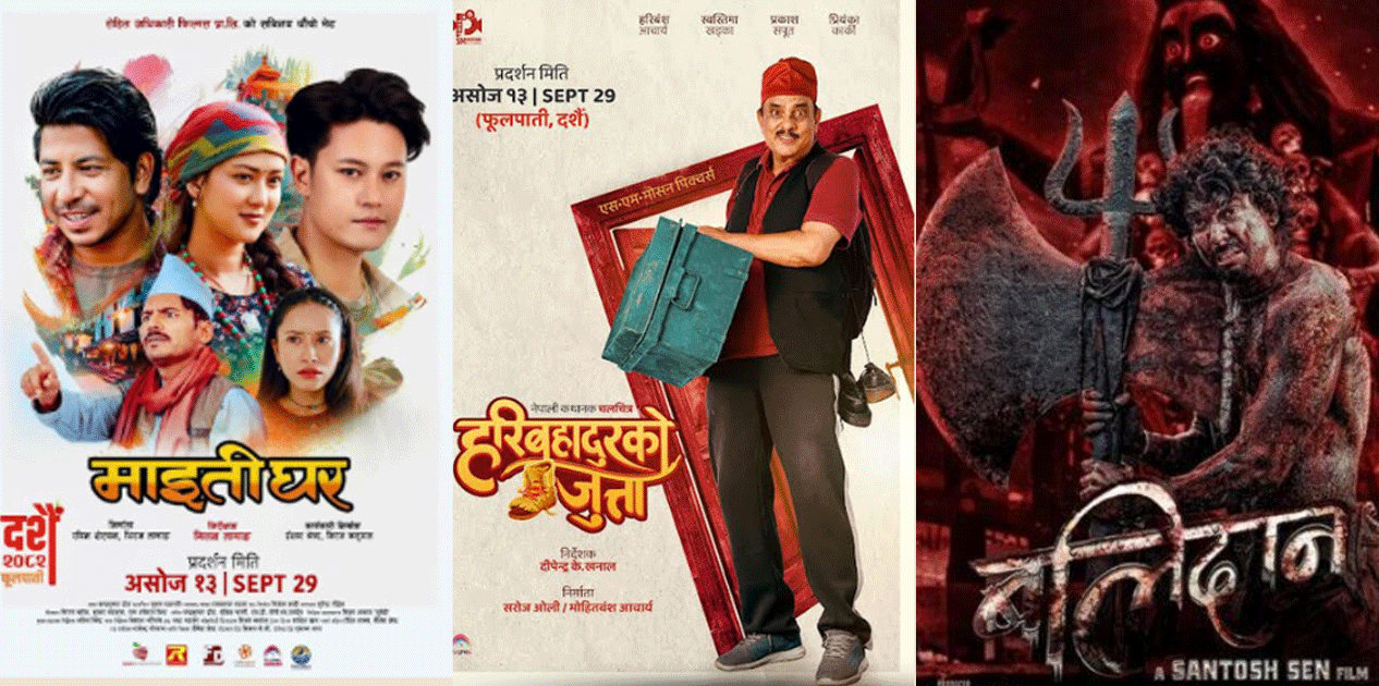 २४ असोज काठमाडौँ । दसैँको अवसर पारेर फूलपाती अर्थात् यही असोज १३ गतेदेखि तीन चलचित्र ‘हरिबहादुरको जुत्ता’ ‘माइतीघर’ र ‘बलिदान’ नेपालभर प्रदर्शनमा आएका छन् । दसैँको बिदा भए पनि तीन वटै चलचित्रले घरेलु बजारमा अपेक्षाकृत व्यापार भने गर्न सकेका छैनन् ।चलचित्र विकास बोर्डको ‘बक्सअफिस २ सिनेमा’ एपमा चलचित्र ‘बलिदान’ ले असोज २० गते राती ११ बजेर ५५ मिनेटसम्म रु तीन करोड ७५ लाख ५३ हजार २५१ व्यापार ग्रस कलेक्सन गरेको तथ्याङ्क छ ।