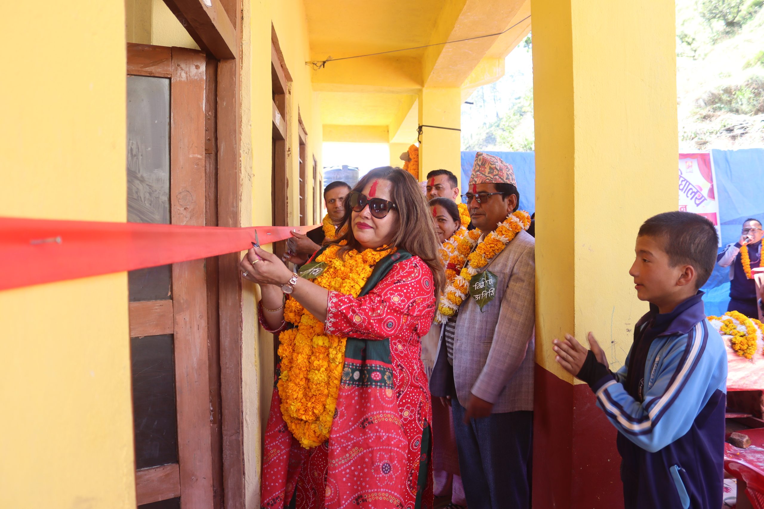 दुई वर्षअघि गएको विनाशकारी महाभूकम्पबाट क्षतिग्रस्त बनेको विद्यालयको स्थानमा करिब ३० लाख रुपैयाँ लागतमा तीन कोठे पक्की भवन र विद्यार्थी तथा अभिभावकका लागि छुट्टाछुट्टै दुईवटा पक्की शौचालय निर्माण गरिएको हो।