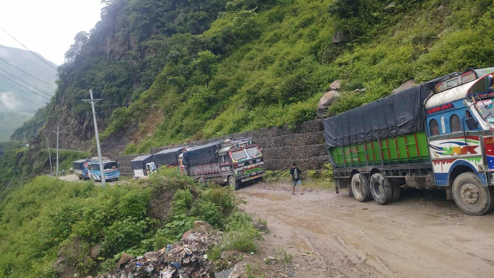 १७ भदौं कालिकोट । कालीकोटको गगनेखोलामा पहिरो खस्दा कर्णाली राजमार्ग बन्द भएकोे छ ।गत आइतबारदेखि राजमार्ग पूर्ण रुपमा बन्द हुँदा जुम्लाबाट करिब १८४ मेट्रिक टन स्याउ बोकेर गएका २३ वटा ट्रक बाटोमै रोकिएका छन् । ती ट्रक पहिरो गएको स्थान नजिकै रोकिएको कृषि विकास कार्यालय जुम्लाका प्रमुख रामभक्त अधिकारीले जानकारी दिए । करिब १३ करोड रुपैयाँ बराबरका स्याउ ती ट्रकमा छन्...